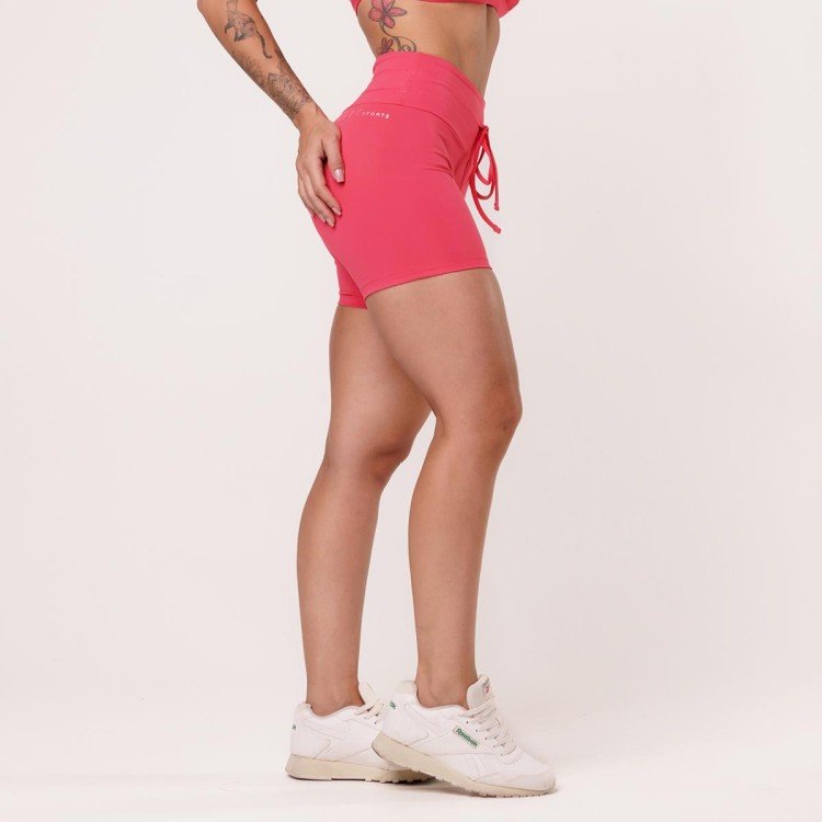 Short fitness com cadarço super-tendência. Seu cós é ligeiramente mais largo e anatômico com um toque extra de compressão na região abdominal devido ao seu duplo pesponto. O comprimento um pouco acima do meio da coxa é perfeito para os dias mais quentes ou treinos mais intensos como Crossfit e HIIT.
