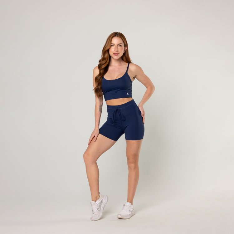 Short fitness com cadarço super-tendência. Seu cós é ligeiramente mais largo e anatômico com um toque extra de compressão na região abdominal devido ao seu duplo pesponto. O comprimento um pouco acima do meio da coxa é perfeito para os dias mais quentes ou treinos mais intensos como Crossfit e HIIT.